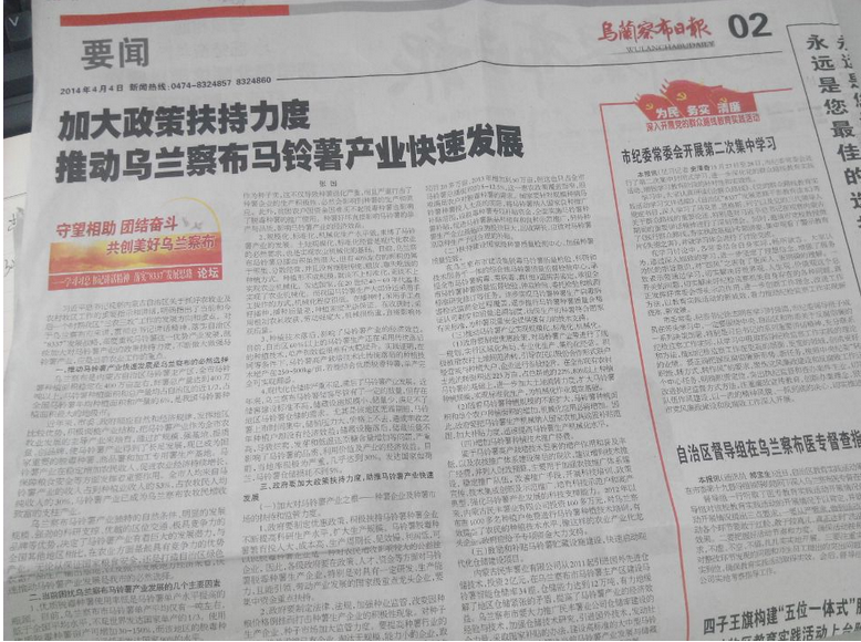 4月4日,烏蘭察布日報(bào)發(fā)表內(nèi)蒙古民豐薯業(yè)有限公司總經(jīng)理張國關(guān)于《加大政策扶持力度,助推馬鈴薯產(chǎn)業(yè)快速發(fā)展》的文章,文章指出: